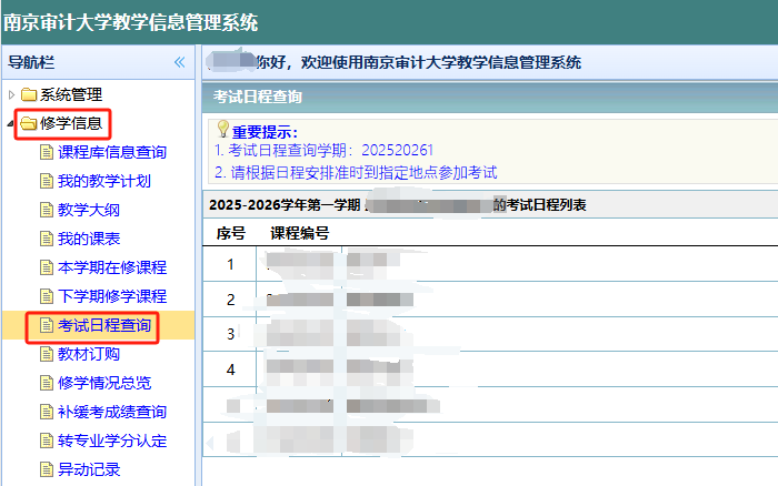 请各位同学登录教学管理信息系统,在导航栏“修学信息——考试日程查询”页面(具体查询路径可参考图1),及时查看个人考试安排,准时参加考试。