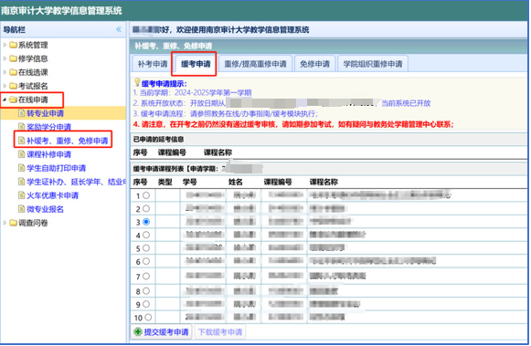 1.缓考仅适用于课程性质为必修课、专业选修课、任选课,且考核方式为闭卷、开卷、上机的课程。同学们在申请缓考科目时,务必留意缓考规则,避免因不符合规则导致申请无效。