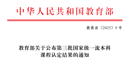 近日,教育部发布了《教育部关于公布第三批国家级一流本科课程认定结果的通知》(教高函[2025]9号),我校共有9门课程入选,其中线上一流课程1门,线上线下混合式一流课程2门,线下一流课程5门,社会实践一流课程1门。截止目前,我校共有国家级一流本科课程23门。