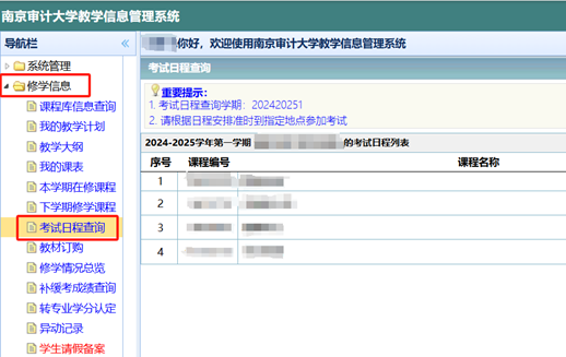 本次缓补考将于2026年2月28日、3月1日、3月4日、3月11日以及3月18日举行。请涉及补缓考的同学及时登录教学管理信息系统,在导航栏的“修学信息——考试日程查询”页面查看具体考试安排(查询路径可参考图1),务必准时参加考试。若因个人原因错过考试,责任自行承担。