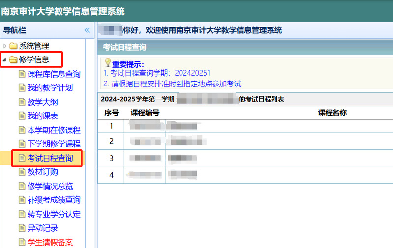 请各位同学登录教学管理信息系统,在导航栏找到“修学信息——考试日程查询”页面(具体查询路径参考图1),及时查看个人考试安排,并严格按照安排准时参加考试。
